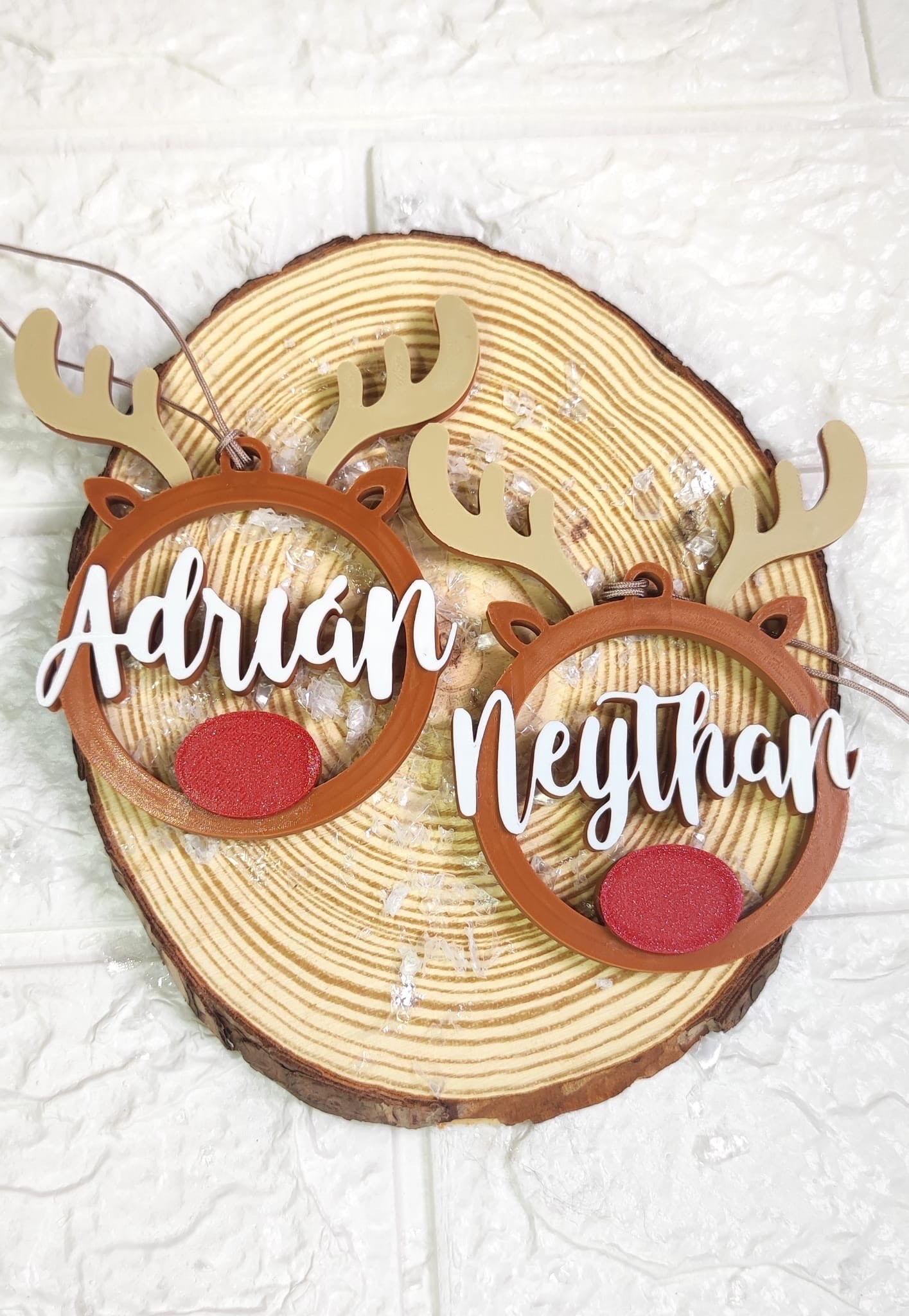 Decora tu árbol navideño con estos encantadores adornos personalizados. Elige entre adorables duendes o renos, cada uno grabado con el nombre que desees.